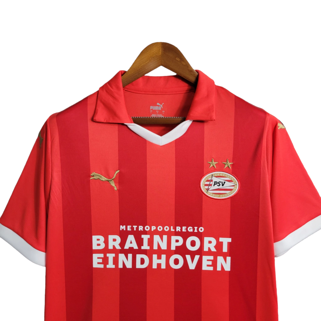 Camisa PSV Eindhoven 23/24 - Torcedor Puma Masculina - Vermelha com detalhes em branco e dourado